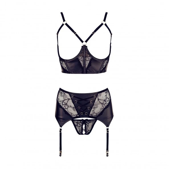 Cet ensemble Abierta Fina est exactement ce qu’il vous faut pour montrer tout votre corps sous son plus beau jour. L’ensemble se compose d’un soutien-gorge sans bonnet. L’armature entoure le sein pour lui donner du volume et une présence indéniable. Cette large armature, en dentelle et tissu façon cuir, lui donne son côté à la fois esthétique et sauvage. Vous retrouvez ce style sur le grand porte-jarretelle. Enfin, le string est ouvert à l’entrejambe pour finir de dénuder votre corps de la plus belle des manières.