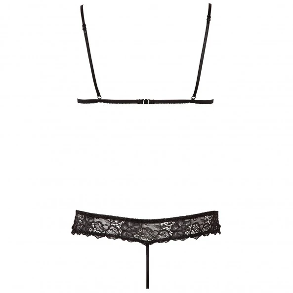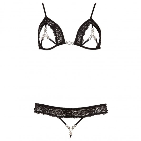 Ensemble de lingerie ouverte par Abierta Fina composé d’un soutien-gorge et d’un string assortis. Un ensemble ouvert et sexy mettant en valeur par des strass scintillants l’entrejambe et les seins, souligné par des contours noirs en dentelles fine.