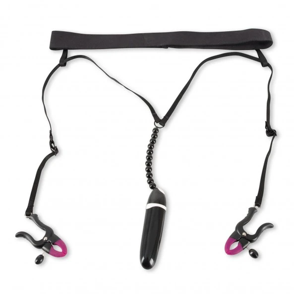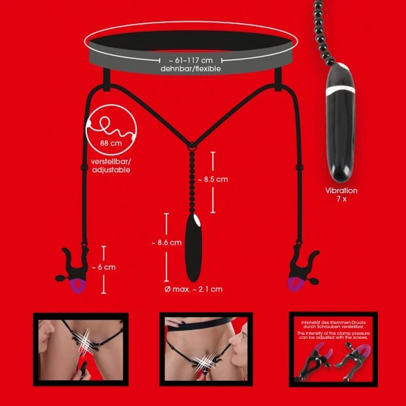 La ceinture Bad kitty dispose de deux pinces à lèvres ajustables grâce à une vis et d’un petit vibromasseur au bout d’une chaîne de perles. La ceinture souple convient à un tour de taille allant de 61 cm à 177 cm.