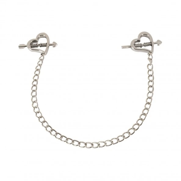 La paire de Pinces à Seins Heart Shaped Bad Kitty se compose de deux pinces à tétons en forme de cœur percé d’une flèche, disposant d’un système de serrage ferme par ressorts. Une chainette relie les deux pinces à tétons.