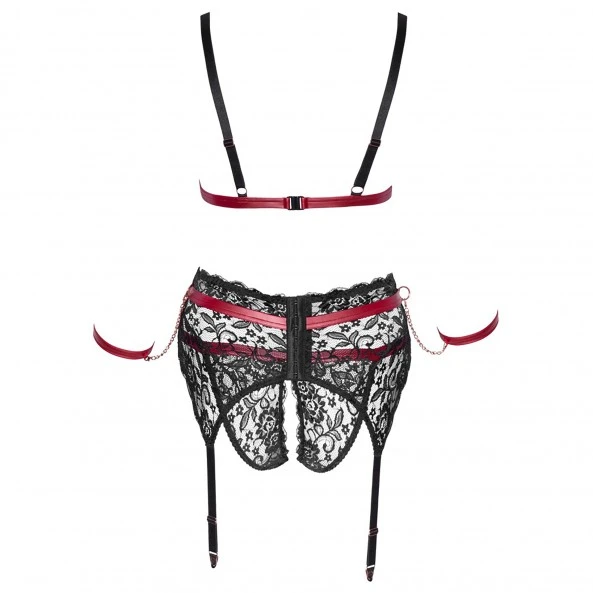 Ensemble de lingerie grande taille Cottelli Bondage comprenant un soutien-gorge souple, un porte-jarretelles, des menottes et une culotte ouverte. Un design sophistiqué en rouge et noire avec éléments en métal doré rose.