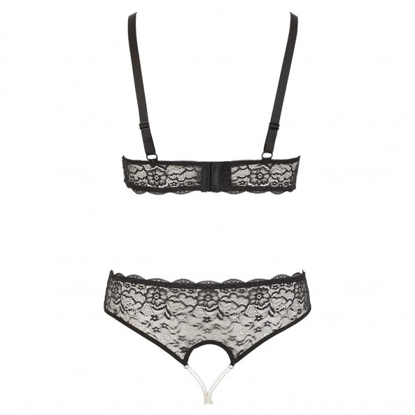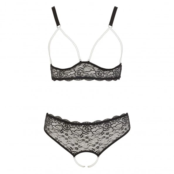 Le soutien-gorge dispose d’une fermeture à crochet et ses bretelles sont réglables. Le string ouvert dispose de deux chaines de perles traversantes, stimulantes et soulignant votre anatomie.