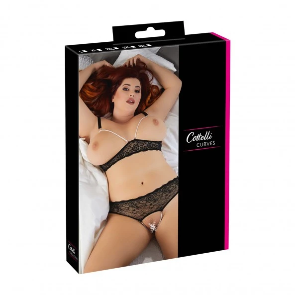 L’ensemble 2 pièces grande taille soutien-gorge et string perles ouverts par Cottelli Collection se compose d’un soutien-gorge ouvert avec perles et dentelles et d’un string ouvert assorti.