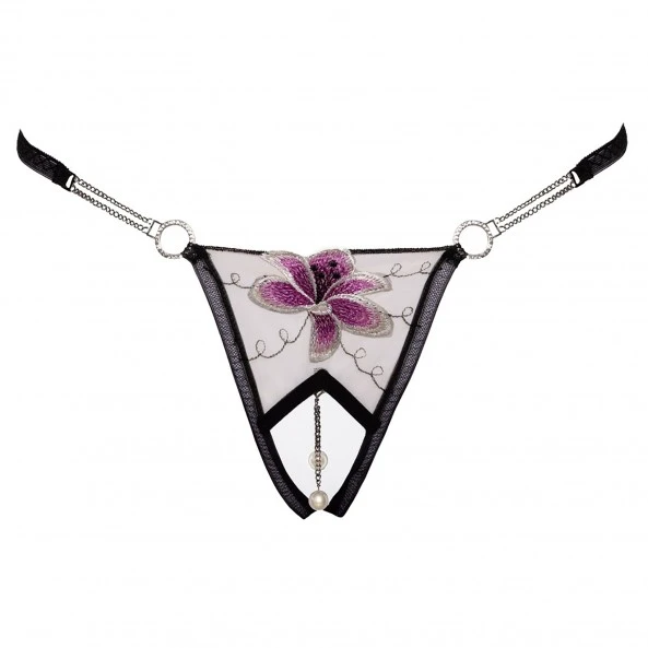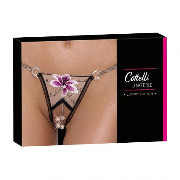 Le String Ouvert Fleur et Perles de Cottelli Lingerie est réalisé en tulle avec une fleur brodée. Il dispose d’une bande stretch, de chainettes et d’anneaux en strass.