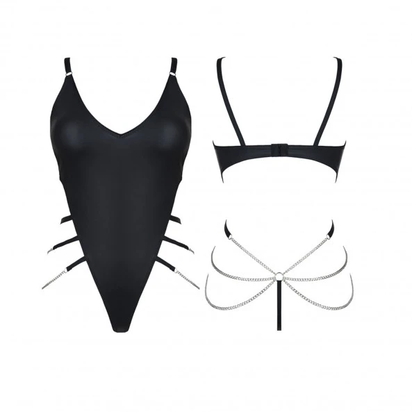 On porte de la lingerie pour se sublimer ou jouer un rôle, selon ses humeurs, selon son envie ou les goûts de son partenaire. Nul doute qu’il va vouloir vous voir jouer le rôle de la maîtresse dominatrice une fois ce body sur votre corps. Son noir profond, avec un tissu façon skaï, donne tout de suite la couleur de ce qui va suivre. La forme, englobant vos seins pour poindre vers l’entrejambe, offre une silhouette affinée et excitante. Vos hanches sont totalement dégagées et le tissu est retenu par de petites chaînettes façon métal qui donne encore plus à ce body sont aspect domination. Vous allez pouvoir inventer de nombreux jeux autour de ce body et passer d’agréables moments à deux.