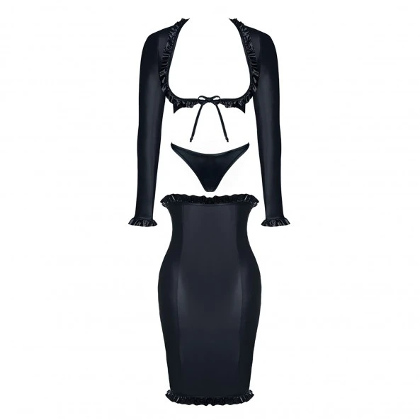 Cette ensemble au style très BDSM est accompagné d’un string taille basse de couleur noire.