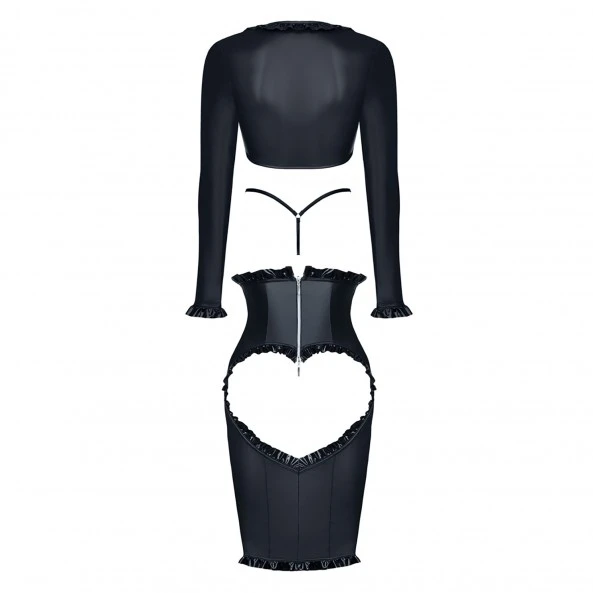 Accompagné d’un chemisier à manches longues, sa coupe très provocante propose un décolleté de la poitrine totalement nue soutenue par un laçage sur le bas des seins.