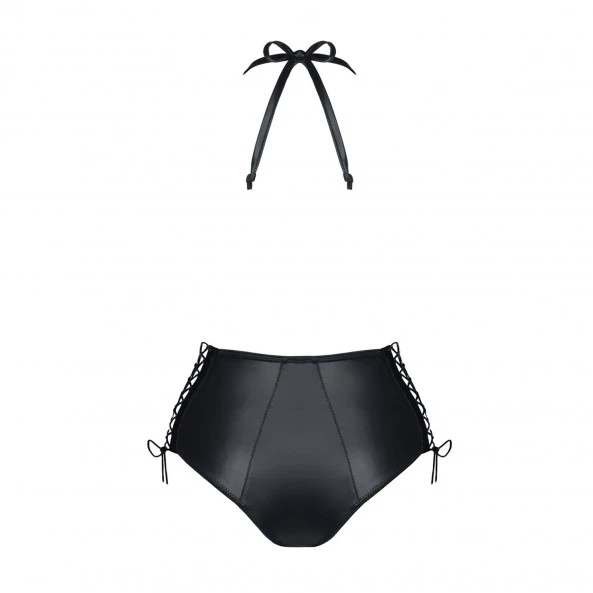 Le bas du teddy comporte une partie en vinyle noir extensible dont la coupe est inspirée des culottes vintages. Comportant des laçages sur les hanches, les fesses seront alors mise en avant pour un effet moulant torride à souhait.