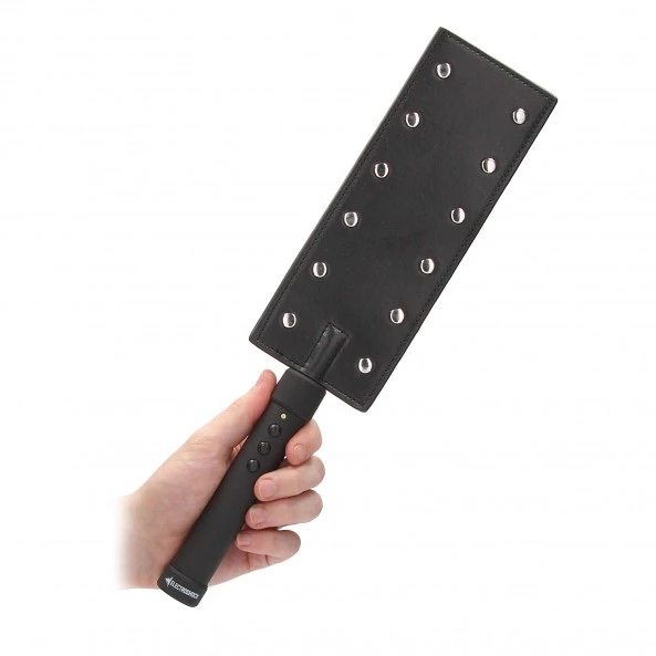 Ce Paddle Electrique métallique conçut en simili cuir, métal et ABS est une petite merveille. Visuellement, il a l’apparence d’un paddle design traditionnelle. Mais équipé de son système d’électro-stimulation, il devient une arme d’intenses plaisirs et de punition redoutablement efficace. Quatre boutons suffisent à piloter ce redoutable accessoire (On/Off (+) et (-). vous aurez le choix entre 5 degrés d’intensité allant de 142 à 312 volts qui seront transmis à votre partenaire par 12 petits plots métalliques à l’extrémité du paddle. ATTENTION : au moment de la mise en route, la position d’intensité de départ est de 240 V. Vous pourrez donc découvrir les joies érotiques de l’électro-stimulation qui pourront vous procurer du bien-être mais également exercer un pouvoir de domination et de punition à votre partenaire de jeux BDSM. Il se nettoie à l’aide d’un chiffon doux légèrement humide.