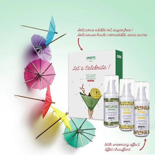 Exsens la marque Française de cosmétiques sensuels, nous présente le coffret massage Let’s Celebrate idéal pour découvrir la gamme d’huile de massage gourmande chauffante.