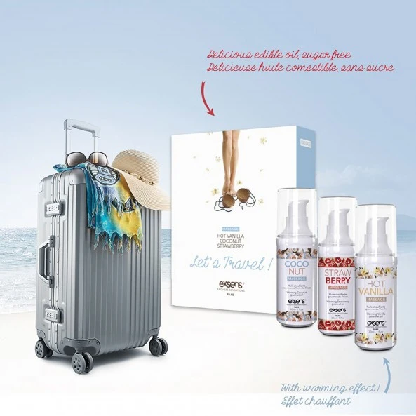 Exsens la marque Française de cosmétiques sensuels, nous présente le coffret massage Let’s Travel idéal pour découvrir la gamme d’huile de massage gourmande chauffante.