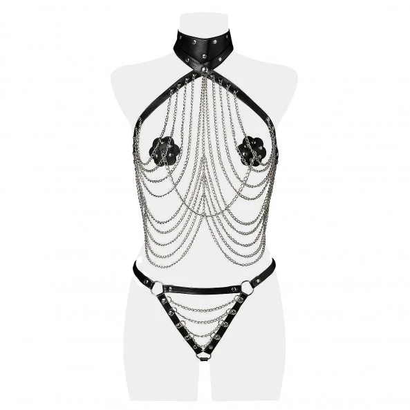 - un harnais-collier avec chaînes en métal qui souligne les courbes de la poitrine