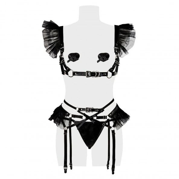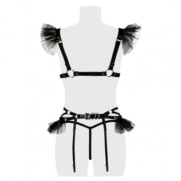 - un porte jarretelles assorti avec sangles simili-cuir et tulle sur les hanches.
