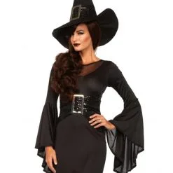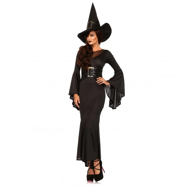 Ce costume 2 pièces est composé d’une robe longue et moulante avec des manches évasées en tissus transparent et fluide. Elle est décoré par une jolie ceinture en sequin et muni d’une boucle argentée. Pour compléter votre tenu le chapeau assorti noir est fourni.