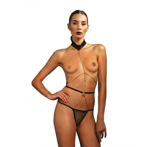 Ce teddy très chic-bondage propose un subtile mélange de chaînettes dorées et de lanière pour une sensualité sans égale.