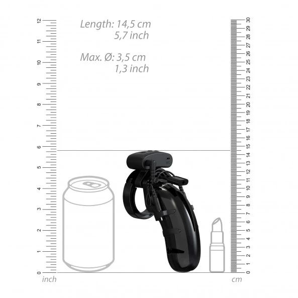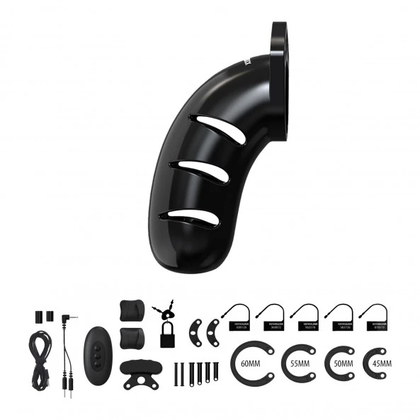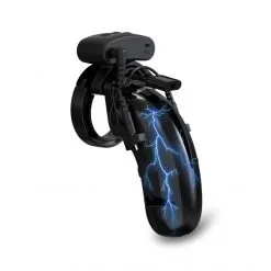 Cette Cage à Pénis est un accessoire masculin de domination BDSM par excellence. Ajoutez-lui un module d’électro-stimulation et vous obtenez la domination absolue. La batterie alimentant les 2 électrodes se trouve sur le dessus de la cage. Elle diffuse un flux continu de quelques impulsions rapides, puis moyenne, puis lente et ainsi de suite… Vous aurez le choix entre 5 niveaux d’intensité. Le pilotage du système d’électro-stimulation peut être effectué soit directement sur le boitier, soit à l’aide de la télécommande fournie. La cage en elle-même comprend de larges ouvertures sur les 2 côtés et à son extrémité. Bien que restrictive, elle est supportable à porter durant toute une journée et ne permet pas l’érection. Sont inclus dans la boîte, 4 anneaux d’introduction de diamètres différents pour s’adapter aux différentes morphologies. Les parties qui assurent le verrouillage de l’ensemble sont en polycarbonate haute résistance neutres et hypoallergéniques. La cage et ses anneaux sont en ABS rigide et neutre de très haute qualité rendant l’ensemble plutôt agréable à porter, mais également hygiénique, facile à nettoyer et à entretenir. Seuls les parties d’électro-stimulation sont en silicone.