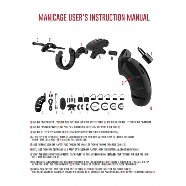 IMPORTANT : Il est impératif de retirer la cage durant le sommeil afin d’éviter toutes blessures par les parties rigides de la cage. Si vous désirez utiliser le cadenas métallique, sachez qu’il est susceptible de faire sonner les portails et autres détecteurs de métaux souvent utilisés par les personnels de sécurité présents dans les gares, aéroports, stade et salles de spectacle. En revanche, pour être indétectable, utilisez les différents fermoirs en plastique fournis dans le coffret et retirez le boitier de contrôle d’électro-stimulation.