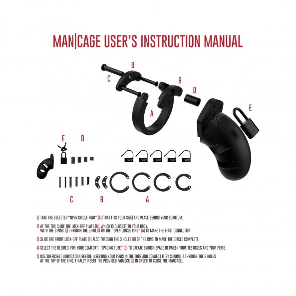 IMPORTANT : Il est impératif de retirer la cage durant le sommeil afin d’éviter toutes blessures par les parties rigides de la cage. Si vous désirez utiliser le cadenas métallique, sachez qu’il est susceptible de faire sonner les portails et autres détecteurs de métaux souvent utilisés par les personnels de sécurité présents dans les gares, aéroports, stade et salles de spectacle. En revanche, pour être indétectable, utilisez les différents fermoirs en plastique fournis dans le coffret.