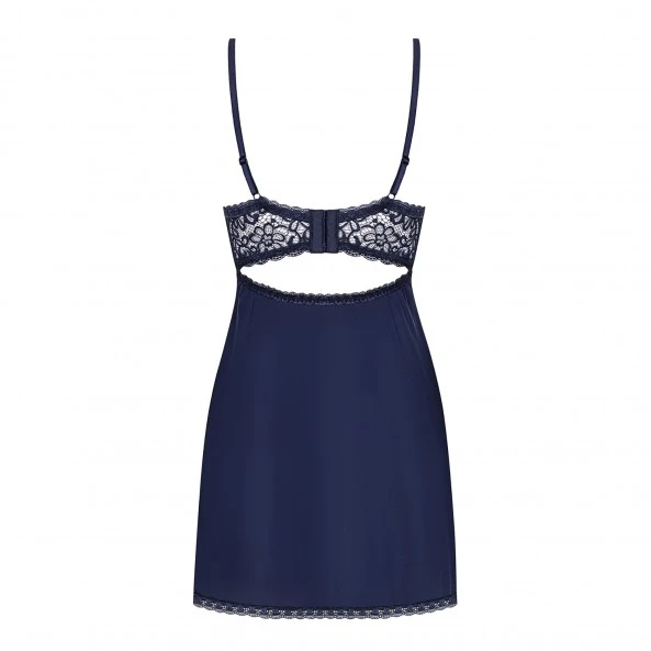 Cette babydoll ainsi que son string assorti en sont le parfait exemple. La partie robe vous couvre de la ligne du buste au bassin dans un tissu d’un bleu nuit à la fois original et très réussi. La partie soutien-gorge jouera la carte de la séduction avec des larges bonnets qui enveloppent bien les seins dans une jolie dentelle bleu nuit elle aussi.