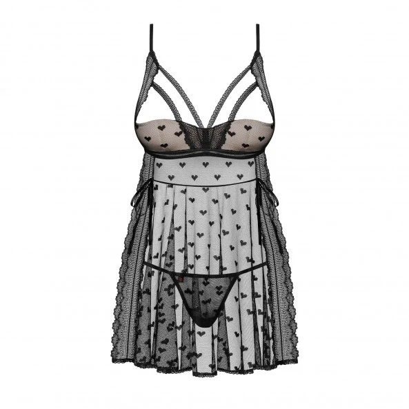 Prenez le pouvoir avec cette babydoll Heartia. Elle a tout pour séduire votre partenaire. Il va se régaler tout d’abord de ce soutien-gorge en demi-tasse, idéal pour offrir une vue bien dégagée sur votre poitrine. Sur vous, c’est ensuite ce tissu résille semi-transparent qui laisse voir vos courbes sensuelles qui va faire de l’effet. Les petits cœurs comme motif en surimpression sont là pour ajouter une touche de sensualité à l’ensemble. Et cette babydoll, très courte, se termine par un string qui dégage complètement vos fesses pour là encore, recto comme verso, ne pas laisser votre partenaire insensible. Vous aussi vous aimerez cette babydoll. Outre l’aspect séduction, vous aimerez le toucher doux, le confort d’un tissu élastique et les nombreux réglages qui vous permettront de sentir cette babydoll Obsessive comme une seconde peau pour vous. Libérée, sexy, c’est vous qui menez la danse ce soir.
