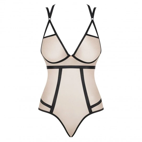Le fabuleux body Nudelia, un produit qui promet de rendre votre soirée romantique avec votre bien-aimé sensuelle et chic. Le body est unique en son genre avec une couleur nude sexy, des bretelles réglables se rejoignant dans le dos avec des bretelles élastiques, des découpes intrigantes au-dessus des seins pour souligner le buste, et des rayures noires pour affiner visuellement le corps. Le fil doré cousu dans le tissu ajoute une touche d’élégance, et la fermeture est réglable pour un ajustement parfait. Le body est fabriqué en matière délicate et élastique pour un confort optimal. Ce produit est idéal pour une soirée romantique et mémorable avec votre partenaire.