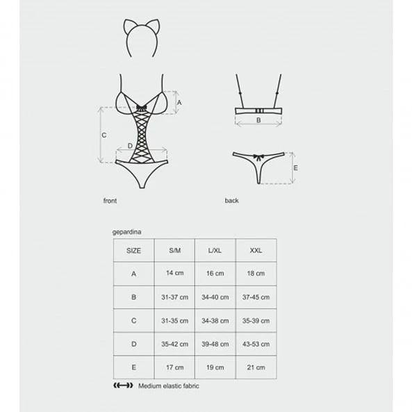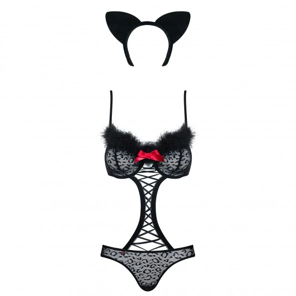 Le style félin est apporté par la présence d’une queue de fourrure amovible ainsi qu’un serre-tête coquin aux oreilles de guéparde.
