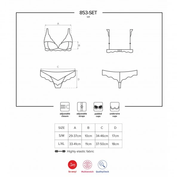 La lingerie n’est pas toujours faite pour les moments d’intimité, mais aussi pour être portée au quotidien et se sentir belle et désirable dedans. Avec cet ensemble 853 de chez Obsessive, vous allez vous sentir belle, désirée, et dans le même temps vous pourrez porter cet ensemble toute la journée. C’est déjà le cas pour une raison de confort avec le tissu et le réglage des bretelles. Mais c’est aussi parce que cette lingerie sait être séduisante sans être trop provocante. Le décolleté est joliment mis en avant, le string dessine bien vos fesses et le motif de la dentelle est réussi. Mais si votre partenaire ne peut détacher ses yeux de vous, n’en soyez pas étonnée. C’est parce que le soutien-gorge et le string ont une bande contrastante qui permet de mieux jouer sur les contrastes pour attirer l’œil.