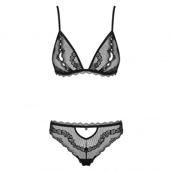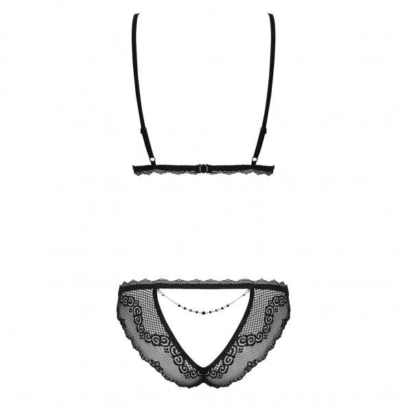 L’ensemble Millagro est une lingerie magnifique qui allie sex-appeal et féminité. Il est conçu pour un ajustement parfait grâce à ses bretelles élastiques et son tissu extensible. Il possède des découpes aux endroits stratégiques, des bonnets de soutien-gorge partiellement ouverts, une matière transparente soulignée de décorations en dentelle, et des pendentifs bijoux à l’avant et à l’arrière de la culotte qui attirent le regard et brillent joliment. Le pendentif sur le derrière est également détachable.