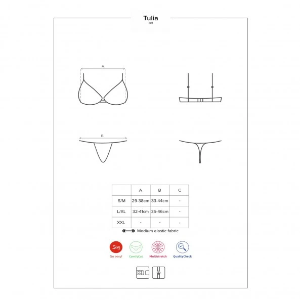 Assez rare chez Obsessive, cette collection Tulia est une vraie réussite aussi bien au niveau des coupes que de l’homogénéité des matières et de la répartition des couleurs. Voilà un ensemble 2 pièces qui pourrait paraître banal au premier regard. Mais quand on l’observe de plus près… Hé bien non ! Le string montant est conçu entièrement en fines dentelles et arbore une ouverture en triangle haut dessus du pubis surplombé d’un petit nœud en satin fuchsia. Le soutien-gorge, quant à lui n’est pas en reste. Il arbore un décolleté plongeant se terminant sur un petit nœud de satin fuchsia. La poitrine est mise en valeur par la dentelle bicolore présente pour souligner la poitrine et également sur le galbe des seins. Ces derniers seront soutenus et visibles au travers du tulle transparent sans tout de même dévoiler les mamelons. Une sincère invitation a la séduction destiné votre partenaire.
