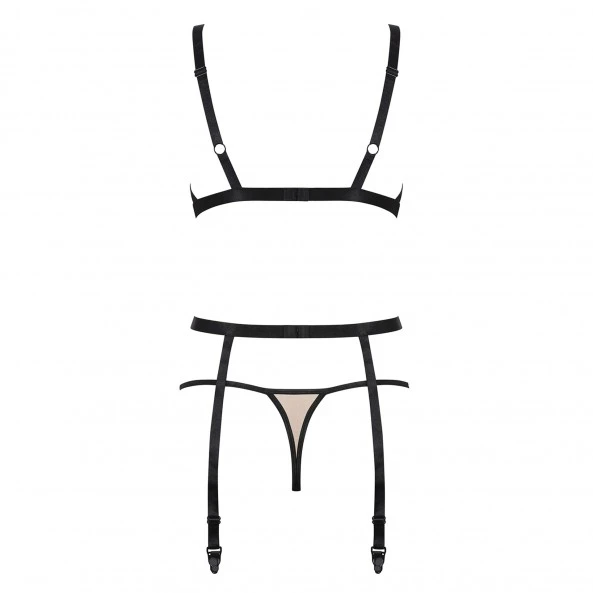 Nudelia d’Obsessive est un ensemble de lingerie composé d’un soutien-gorge, d’un string et d’un porte-jarretelles. Il a des bretelles réglables et est fabriqué avec un tissu élastique et un fil doré. Il met en valeur les hanches, les seins et les fesses, et a des rayures noires subtiles sur les bonnets de soutien-gorge. Il est proposé dans une combinaison de couleurs nude et noir profond. Le porte-jarretelles avec bretelles réglables soutient parfaitement les bas. Les bas ne sont pas inclus dans l’ensemble. Il est fabriqué en matériau souple pour plus de confort.