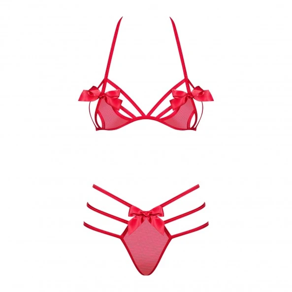 Faite de votre corps un présent séducteur qui, sans doute ne laissera pas votre partenaire de marbre. Cet ensemble 2 pièces Giftella est une vraie réussite. Il allie plusieurs choses : un aspect festif incontestable qui se caractérise par la présence de nœuds en satin rouge vif qui se répartissent parfaitement sur l’ensemble. L’effet minimaliste vous donnera le côté provocateur qui changera tous pour votre partenaire de jeux coquins. Le soutien-gorge et le string ajourés regroupent toutes les textures caractérisant la gamme Giftella. Choisissez d’ajouter à cet ensemble les bas biege avec les nœuds de satin assortis S808 et vous voilà plus belle que jamais. L’ajustement est assuré par le réglage des lanières ainsi que par des matériaux doux et extensibles très agréables à porter.
