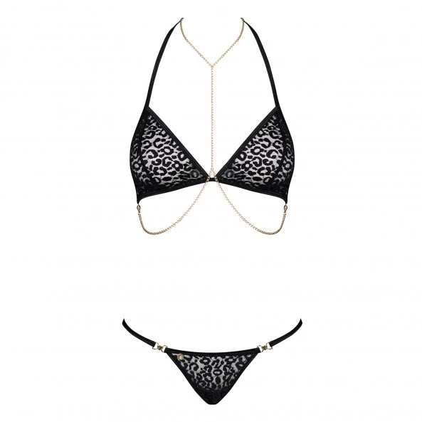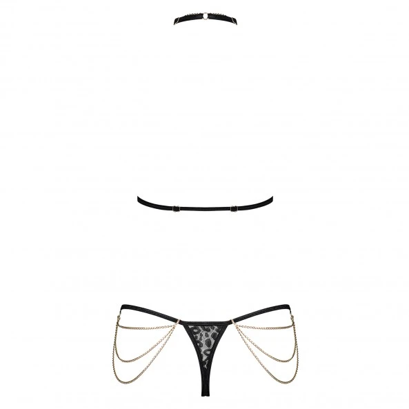 L’ensemble de lingerie Pantheria d’Obsessive comprend un soutien-gorge, un string et des chaînes. L’ensemble est noir avec un imprimé léopard et des décorations uniques sous forme de chaînes sensuelles et de maillons dorés. Il y a une chaîne sexy et détachable sous le cou, un string avec des maillons et des chaînes accrocheurs et des bretelles réglables pour un ajustement parfait. La lingerie est faite de matières agréables et souples.