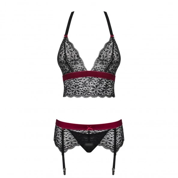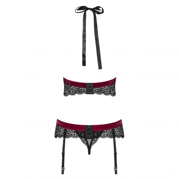 Rossita a tous les arguments pour plaire et exciter votre partenaire. Cet ensemble trois pièces joue habilement avec les couleurs et les matières. Une dentelle noire et fine pour laisser imaginer les formes qui se cachent dessous, des empiècements de velours rouge pour jouer sur la séduction, le contraste pour mieux souligner encore vos courbes. Voilà qui devrait plaire à votre partenaire, comme le laçage autour du cou ou bien le réglage facile du top qui fait soutien-gorge. Ce que l’on retiendra surtout, c’est l’effet sexy et excitant d’une lingerie qui ne vous déshabille peut-être pas entièrement mais qui vous met superbement en valeur.