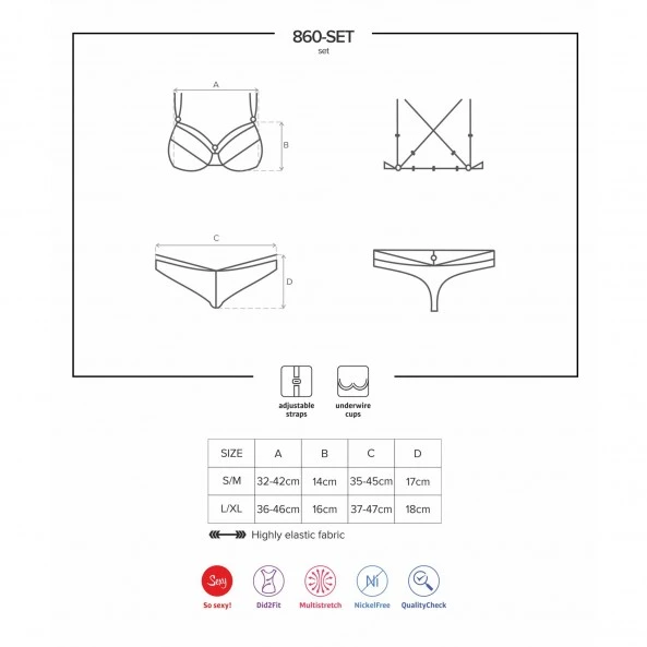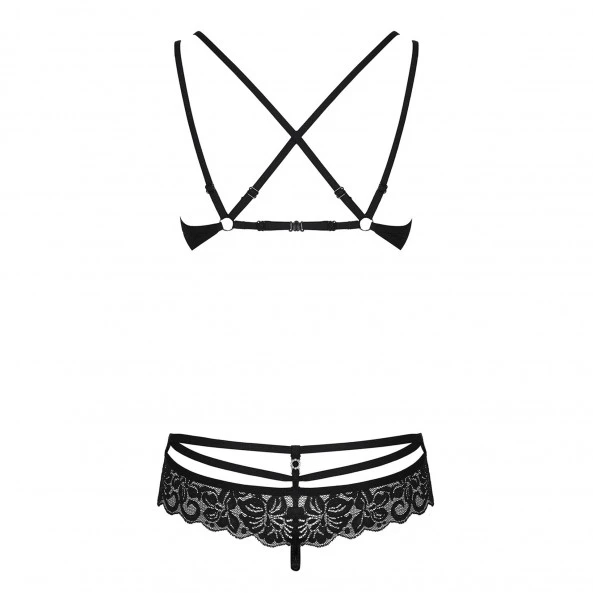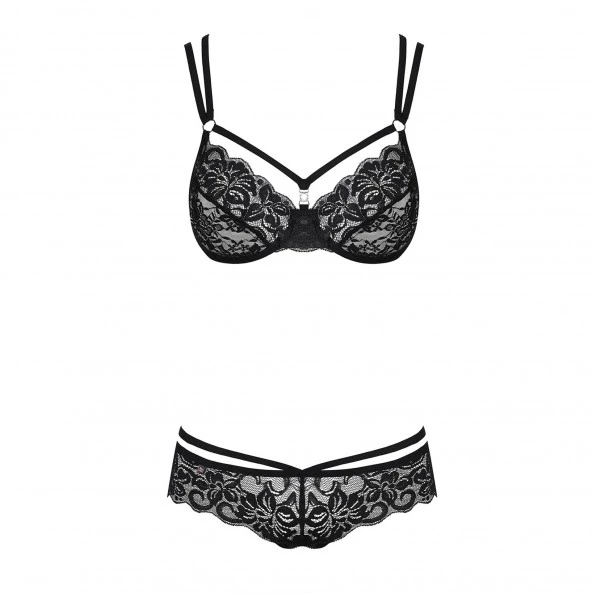 Vous avez envie d’être irrésistible, de prendre le contrôle sur votre partenaire ? Alors cet ensemble glamour de chez Obsessive va vous aider à y parvenir. En accentuant les courbes de votre corps, il va vous rendre encore plus sexy. Cela commence avec le soutien-gorge dont les doubles-lanières permettent d’accentuer la forme du sein, et d’avoir plus de confort au niveau des épaules. L’ouverture du bonnet et le petit bijou brillant au milieu finiront de vous convaincre du pouvoir de ce soutien-gorge de dentelle florale noire. Le string est tout aussi sexy avec son deuxième jeu de lanières qui dessinent vos hanches de façon élégante. Sans avoir besoin de faire de surenchère dans le minimalisme, il va faire des merveilles.