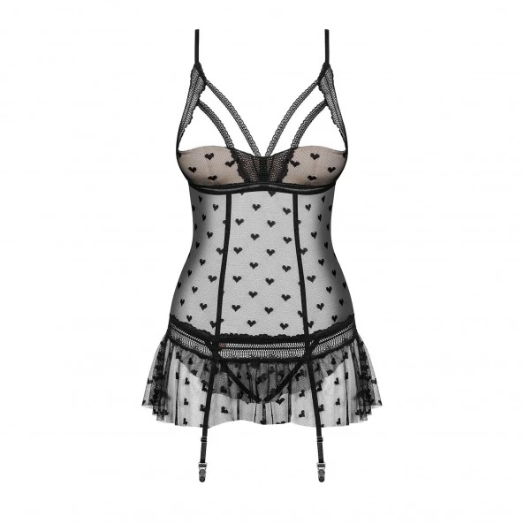 Obsessive est une marque déjà présente dans ce tiroir où vous cachez votre lingerie fine. Si ce n’est pas encore le cas, ce modèle de guêpière Heartia sera un parfait exemple des gammes de la marque, qui oscille toujours entre élégance et sensualité. On retrouve d’ailleurs cette sensualité sous-jacente à tous les produits d’Obsessive dans cette guêpière très coquine. Elle offre un joli décolleté, le tissu de résille est orné de cœurs en surimpression pour ajouter une touche de féminité. Au niveau de la longueur, la guêpière se termine par un petit volant, façon jupette, tellement court qu’il ne cache en rien le string ouvert qui va de paire avec la guêpière. Voilà, vous n’avez plus de doutes sur l’aspect coquin de cette tenue qui sait malgré tout avoir une apparence sage, et être torride.