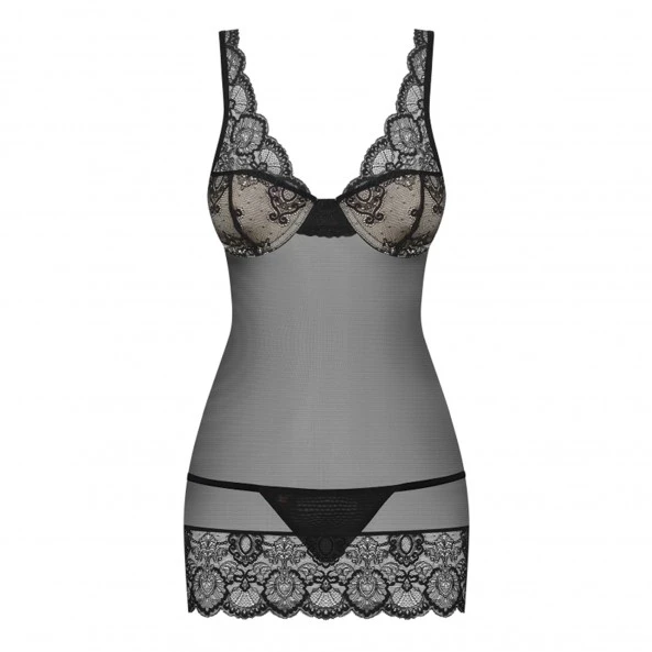 En vous sommeille une femme sexy et vous ne savez pas comment le révéler ? Vous n’osez pas porter des choses trop dé couvrantes, mais ne voulez pas passer à côté du plaisir de porter de la lingerie qui mette en valeur votre féminité. Cette nuisette 853 de chez Obsessive est alors sans doute le meilleur compromis. Sans être trop découvrant, le décolleté, la dentelle ainsi que la courte longueur de tissu permettent de mettre en valeur l’ensemble. Pour attirer l’œil, les bandes de contraste au niveau des bonnets du soutien-gorge permettent de donner du relief aux seins. Enfin, vous trouverez dans la boîte le string assorti à cette superbe nuisette.
