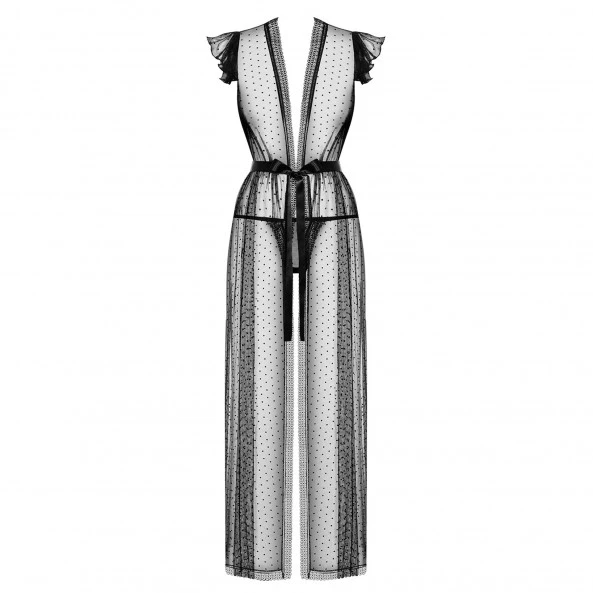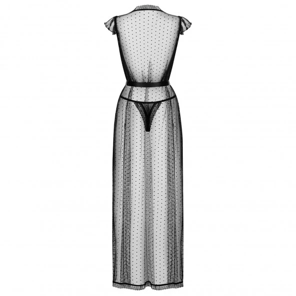 Il y a parfois des moments où la délicatesse de la lingerie est un meilleur excitant que la mise à nue de tout le corps. C’est pourquoi ce peignoir de chez Obsessive va vous aller à ravir. Il est à la fois élégant, sensuel et parfaitement excitant. Des épaules à la cheville, il se compose d’un tissu doux, fluide et complètement transparent. Son motif graphique lui donne un certain cachet, et le ruban du satin permet de cintrer la taille et vous offrir une posture encore plus séduisante. Vous apprécierez de vous sentir complètement à l’aise, ce qui libérera votre esprit pour des pensées plus coquines et vivre des moments plus intenses. La culotte assortie finira de compléter l’ensemble avec goût, et le strass positionné au milieu ajoutera si nécessaire une nouvelle touche coquine qui ne laissera pas de doutes sur vos intentions.