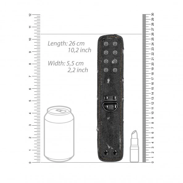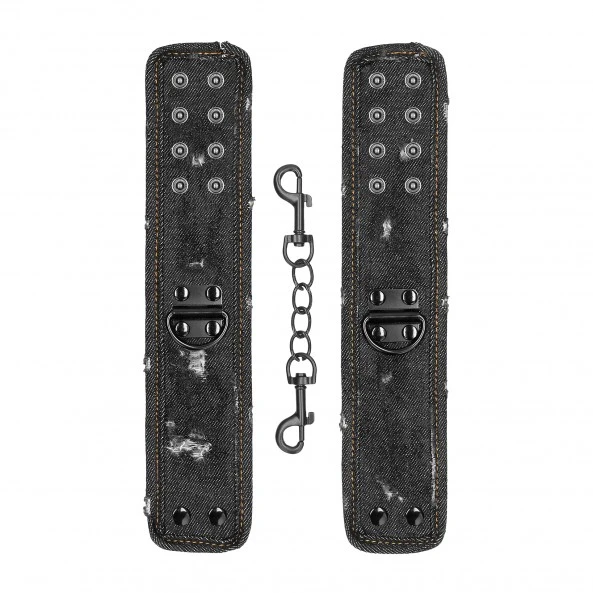 RĂ©alisĂ©e en denim et mĂ©tal. Les menottes se ferment grĂące Ă des boutons poussoirs et s’ajuste Ă la plupart.