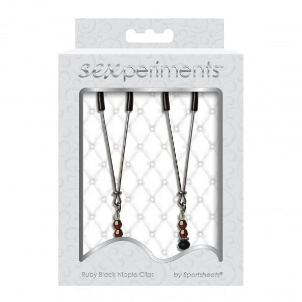 Paire de pinces à seins Ruby Black Sex And Mischief en métal. Les pinces sont ajustables à la tension souhaitée grâce à une bague de serrage qui coulisse.
