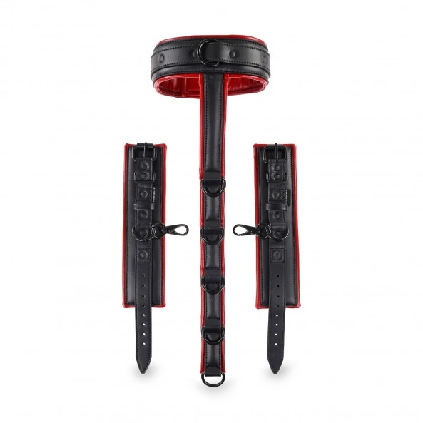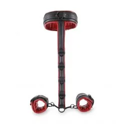 Dans le détail : Simili-cuir épais, rembourré et doux à la fois pour le tour de cou et les menottes garantissant confort et look BDSM épais et affirmé. 5 anneaux de réglages pour la hauteur des bracelets menottes – 1 mousqueton de détachement rapide par bracelet – 8 crans de serrage pour chaque bracelet offrant grande amplitude pour s’adapter à toutes les personnes.