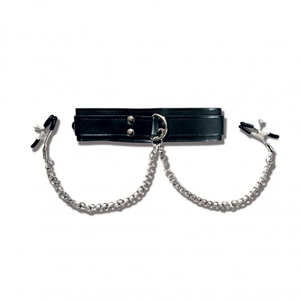 Collier en cuir végétalien avec pinces à seins reliées par chaînette. Anneau permettant l’utilisation d’une laisse.