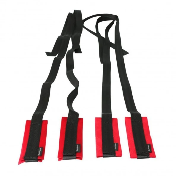 Le Kit Bondage Sexy Submissive Sportsheets comprend un bandeau occultant rouge, 4 attaches pour poignet ou cheville avec sangle de 112 cm et un plumeau plaisir pour des caresses excitantes.