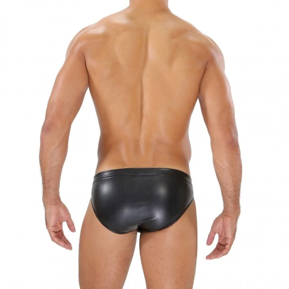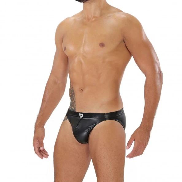 Le Mini Brief Fetish TOF Paris est très échancré et taille basse, offrant un effet sexy garanti et un style fetish. Réalisé en microfibre stretch et confortable, il imite parfaitement le cuir pour un effet slip en cuir saisissant.
